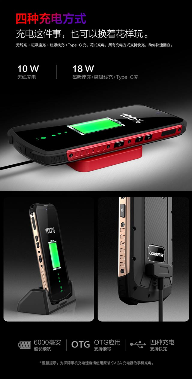 選擇這款手機,就是為自己選擇了更多的方便,6000m AH 的大容量電池,帶來更長的續(xù)航時間,陪伴你走過更多戶外運動的行程。為了讓充電更簡單,它擁有四種充電模式,可以選擇充電線進行充電,也可以選擇磁吸座充,還支持無線充電,如果在外實在沒有電源,還可以選擇兩個手機之間反向充電,這樣多種多樣的充電方式,能夠更好的保障你的手機時刻有電。不僅如此,它還能夠做到快充,讓我們用更短的時間,享受到更多的電量。