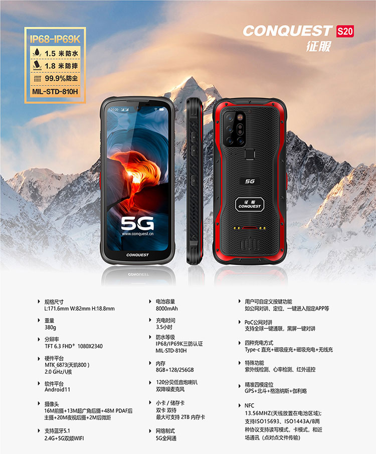 2021款 CONQUEST征服S20 5G防爆智能手機即將上市!預約通道已開啟!參與方式:即日起接受線下預定,只需繳納100元預定金,即可在正式下單發(fā)貨時,獲贈原裝通用車載支架1套,并享有優(yōu)先發(fā)貨權。預定電話:13244860095(微信同號)