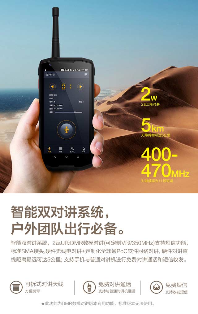 CONQUEST手機(jī)內(nèi)置硬件對講,摒棄了采用手機(jī)信號,付流量費(fèi)的復(fù)雜對講模式,頻段在400-470MHZ之間,傳輸距離空曠距離3Km以上,手持式頻道對講模式,可在無手機(jī)信號、無手機(jī)卡的情況下,進(jìn)行自由流暢的對講,。使您得到暢快的溝通,又享受專業(yè)交流的樂趣,內(nèi)置PTT,可編組群呼,實(shí)現(xiàn)團(tuán)隊(duì)辦公、結(jié)伴驢行等活動(dòng)的便利性和安全性。