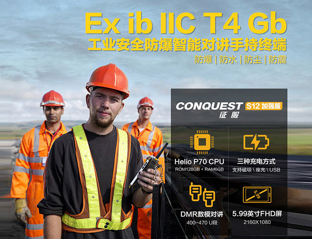 CONQUEST征服 S12工業(yè)防爆手機除了支持POC無線網(wǎng)絡(luò)對講,還支持DMR數(shù)模一體硬件窄帶專網(wǎng)對講,支持400MHZ-450MHZ對講頻段。是征服品牌第一款DMR數(shù)模一體對講三防智能通訊終端,支持LTE 4G通信、數(shù)字對講、模擬對講、POC公網(wǎng)對講手機,采用八核處理器、5.99英寸FHD+(2160*1080)高清分辨率。八核2.5GHZ處理器、支持6G+128G機身存儲,可支持512GB內(nèi)存。原生安卓9.0操作系統(tǒng),4G雙VOLTE技術(shù)可同時通話上網(wǎng)。2100萬后置攝像頭、專業(yè)F/1.8大光圈、PDAF相位對焦。不僅可以拍出高清照片,還可進行水下拍攝,光線陰暗地區(qū)拍照等。